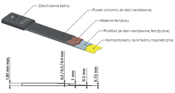 (4) Taśma ochronna samoprzylepna. Jest to metalowy pasek ochronny, który posiada warstwę kleju umożliwiającą przyklejenie go do magnetycznej taśmy pomiarowej.