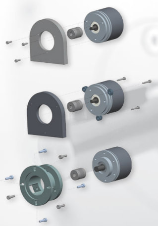 Enkodery obrotowe dostępne są w całej gamie różnych wykonań. W ofercie jest kilkadziesiąt rodzajów enkoderów z wałem litym lub z wałem drążonym (z otworem). Na poniższym rysunku widać najpopularniejsze wykonania enkoderów i sposobów ich montażu dla obu wersji.