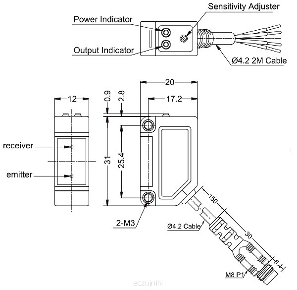 Precyzyjny czujnik optyczny, odbiciowy, zbieżny służący do wykrywania dowolnych obiektów bez połysku (również czarnych i o niewielkich rozmiarach). Zasięg 7cm, zasilanie 12-24Vdc. wyjście PNP L.on/D.on., przewód 2 metry