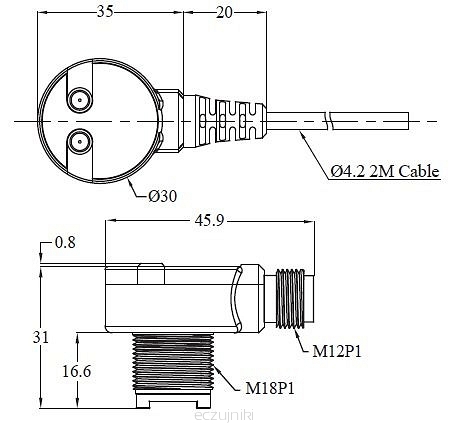 - przewód umieszczony pod kątem 90° w stosunku do osi czujnika - oszczędność miejsca podczas instalacji